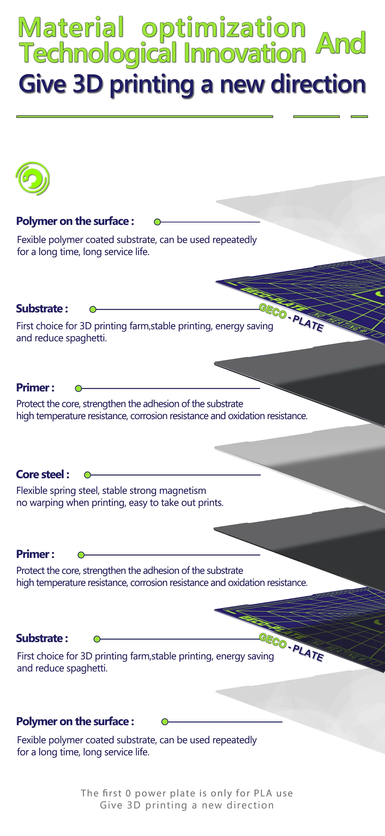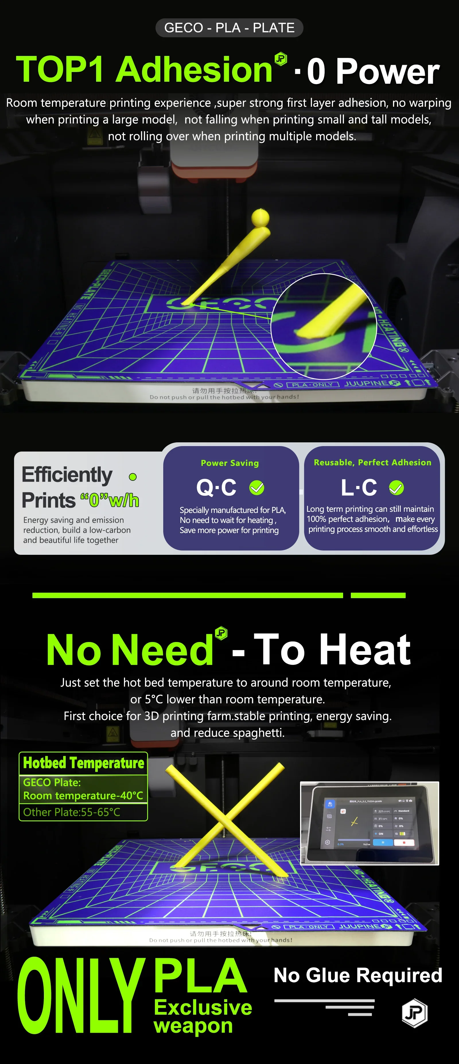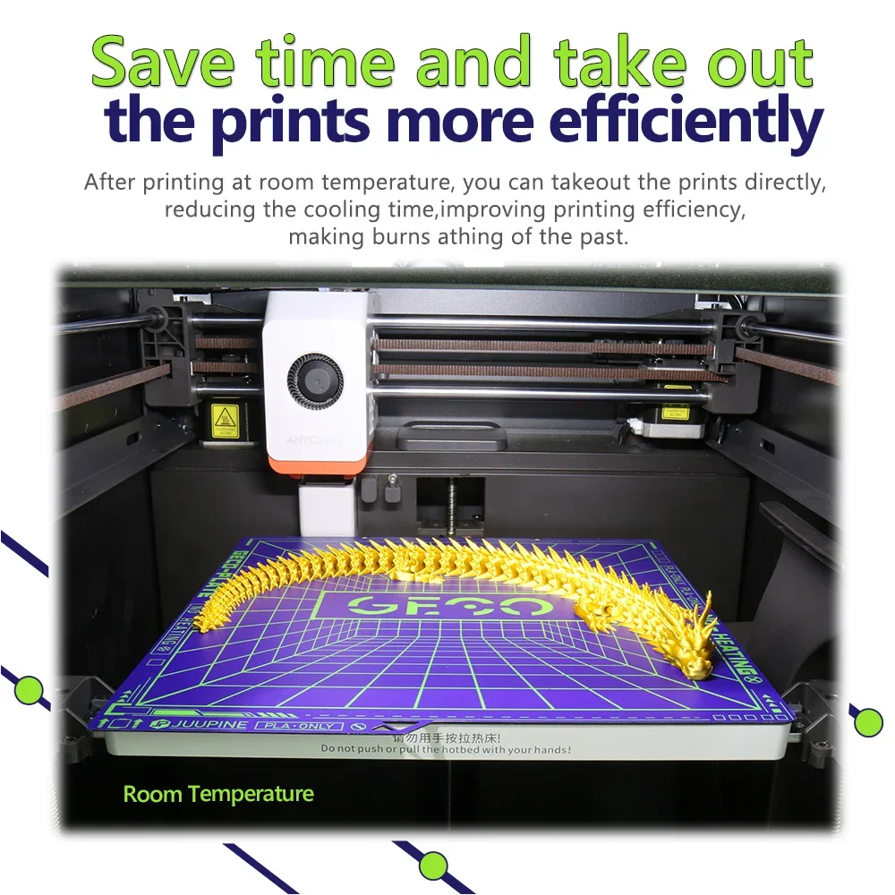 Specially manufactured for PLA,no need to wait for heating up the bed .Under 0℃ printing, with less power,it can save you more energy and reduce printing costs.