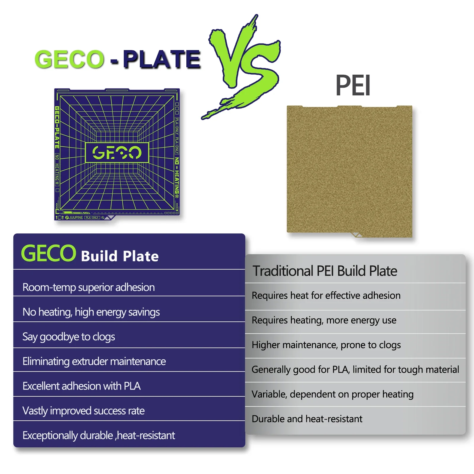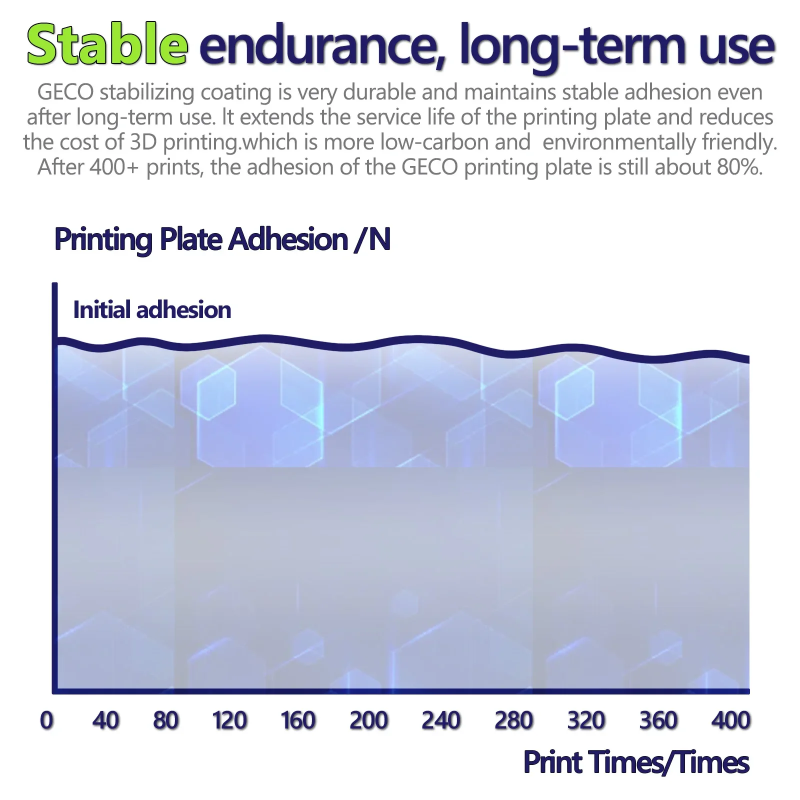 It has excellent adhesion without heating the platform,The model can be firmly attached to the GECO surface,Even beginners can print easily.Long term printing can still maintain 100% perfect adhesion,say goodbye to glue and spray, make every printing process smooth and effortless.