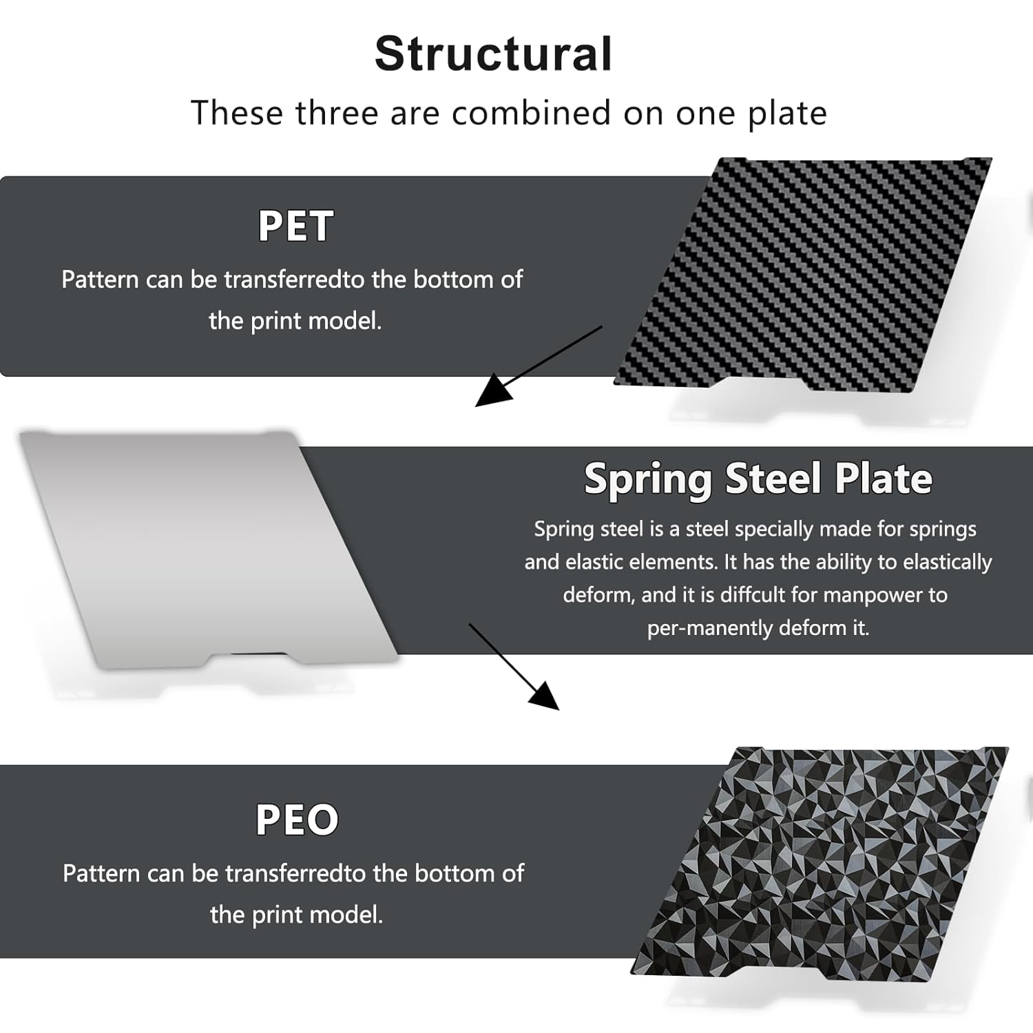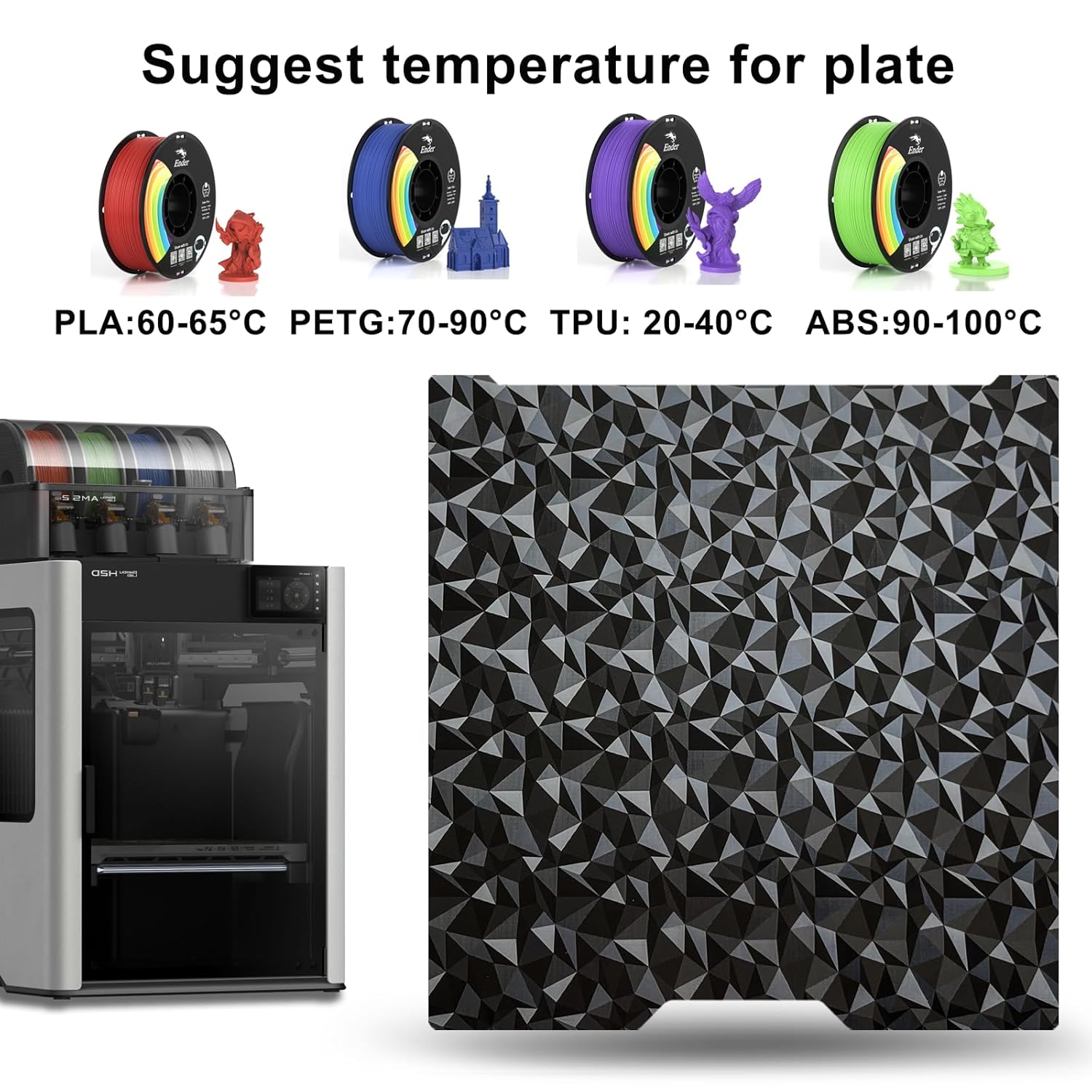 - Durable & Heat-Resistant Construction: Built with high-temperature-resistant materials (withstands up to 120°C), the plate resists scratches and chemical corrosion even after repeated use and cleaning. The H2S PET and PEO surfaces maintain their integrity, ensuring long-lasting performance for PLA, TPU, PETG, and other compatible filaments (adjust settings for specialty materials)
