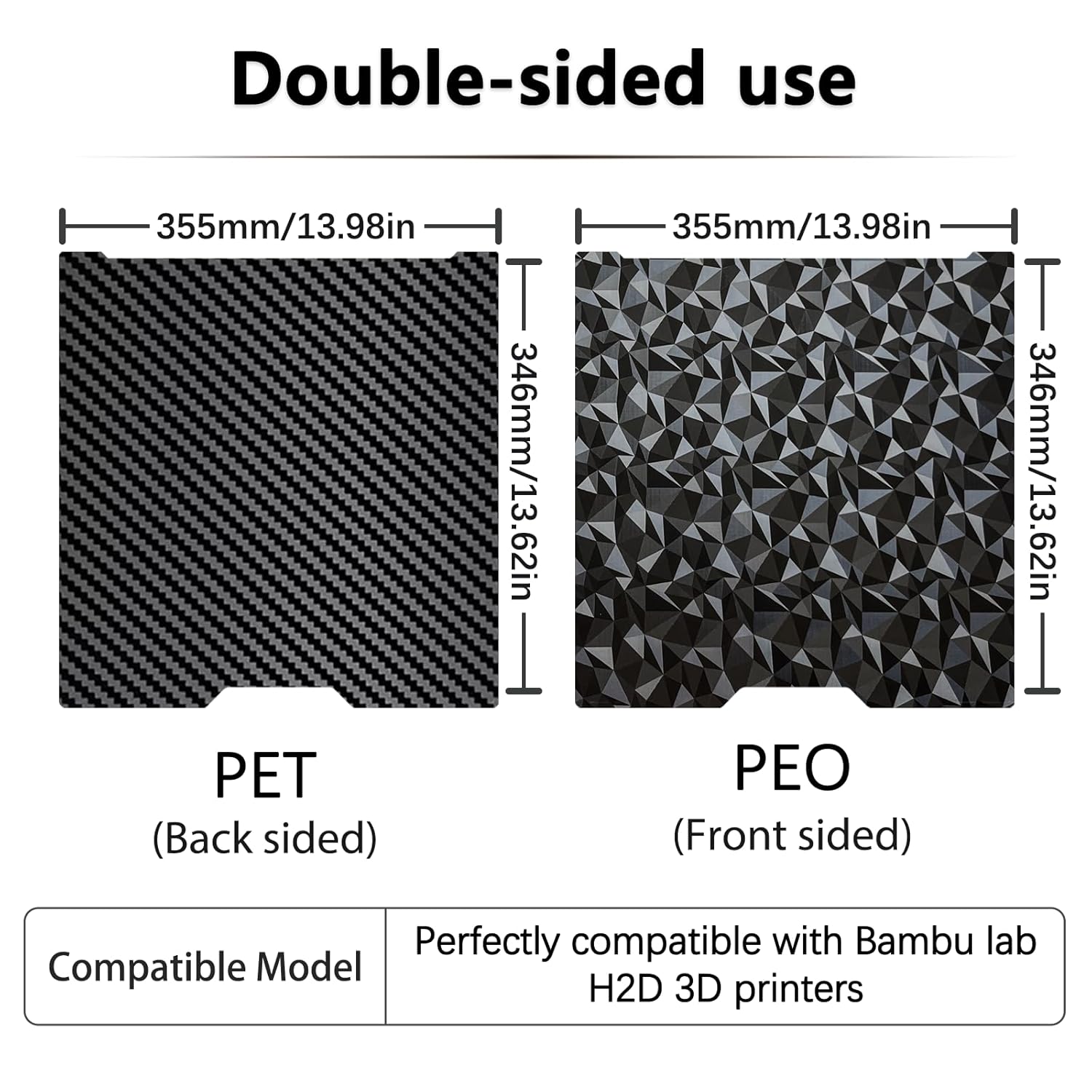 - Suitable for bambu lab H2D/H2S series 3D printer: Featuring a carbon fiber-textured PET side and a diamond-patterned PEO side, the dual-surface design caters to diverse printing needs—ideal for both smooth finishes and intricate diamond-patterned creations. Each side offers distinct advantages, expanding material compatibility and doubling the usable life compared to single-sided plates