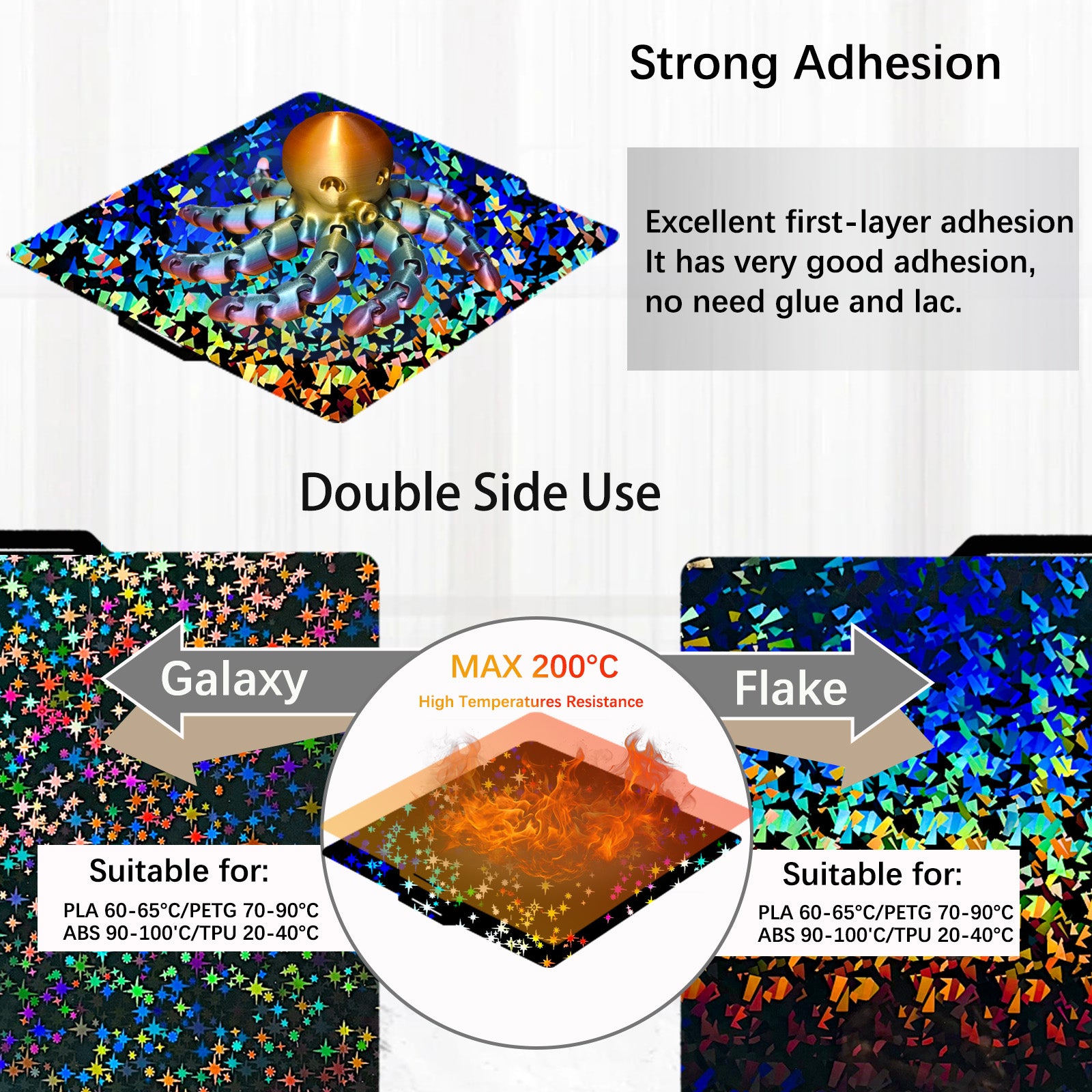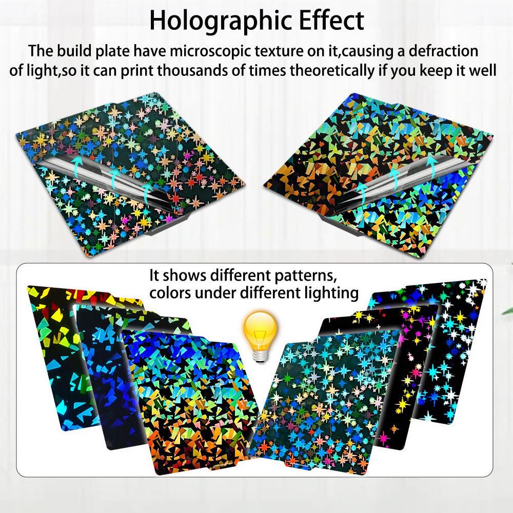 - 【Features】Wefuit combines two different holographic patterns into the bambu lab build plate. one side is a Flake patterns, like exquisite artworks polished by time, emitting a strange light; The other side is a Galaxy pattern, emitting a sparkling light, very dazzling. The bottom of the model will present rich and layered colors at different lighting angles, bringing a dreamy visual effect. The combination of Flake and Galaxy gives you a romantic and festive atmosphere, adding more interesting inspiration to your creations.