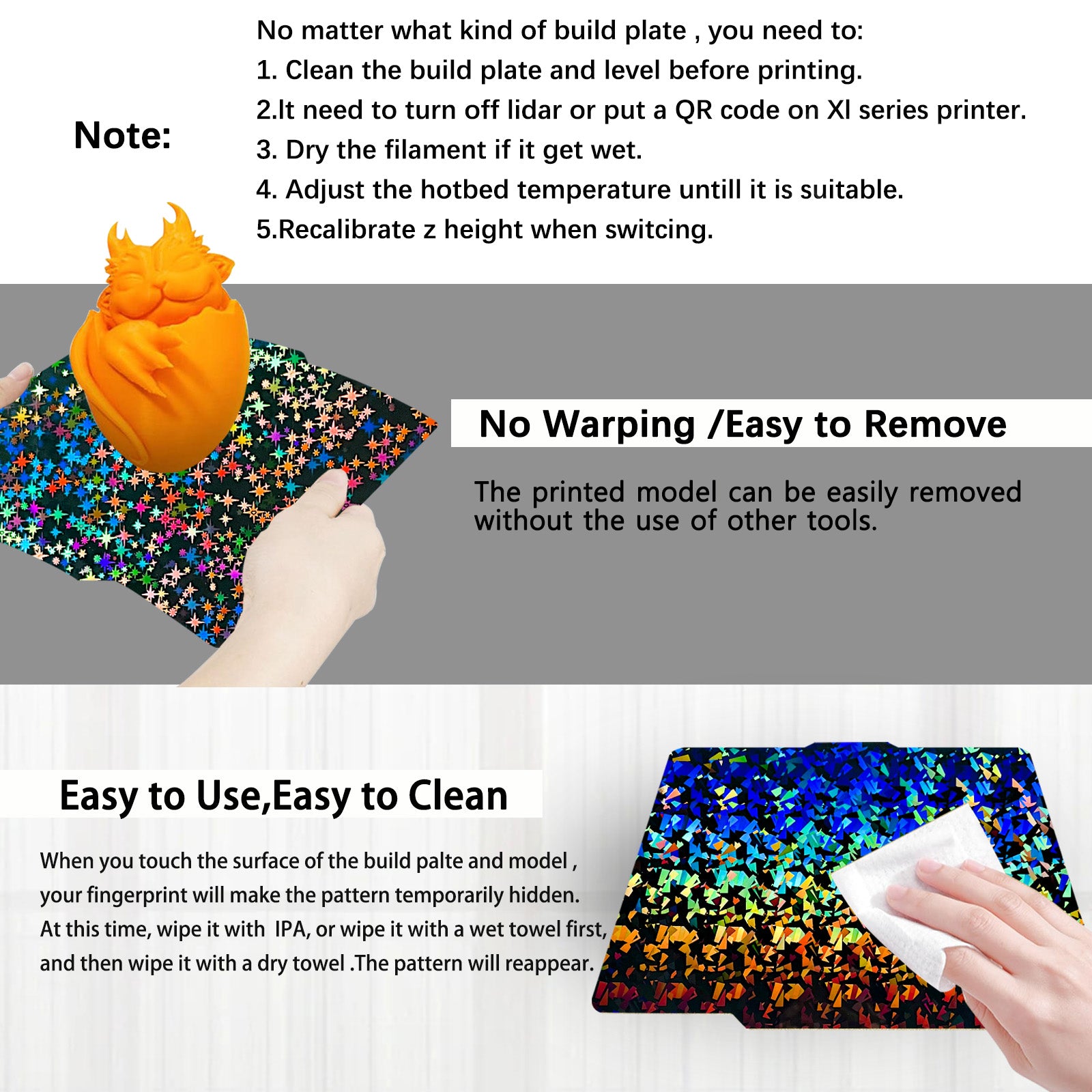 - 【Easy to Maintain】The Flake or Galaxy pattern of the printed model may fade or disappear if wiped with hands or other oily objects, but don't worry,You only need to wipe the bambu build plate surface with a wet tissue and then wipe dry it with a dry tissue to keep it clean. It will become as clean as the first time you got it,the pattern can be reappeared !