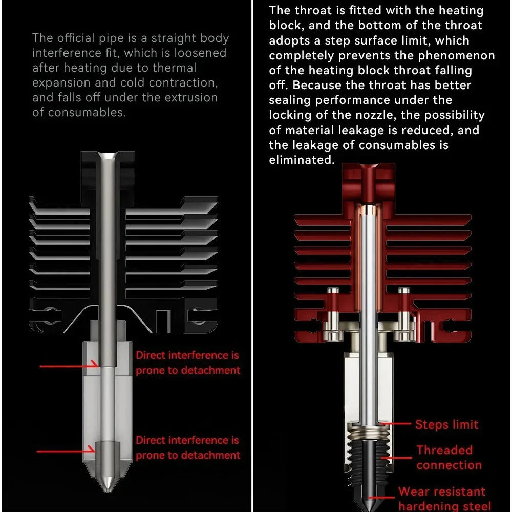 Heating block is upgraded to chrome-zirconium copper nickel plating treatment,.high temperature printing resistance,fast heat conduction..Nozzle is made of hardened steel after quenching and hardening treatment,.550°C.