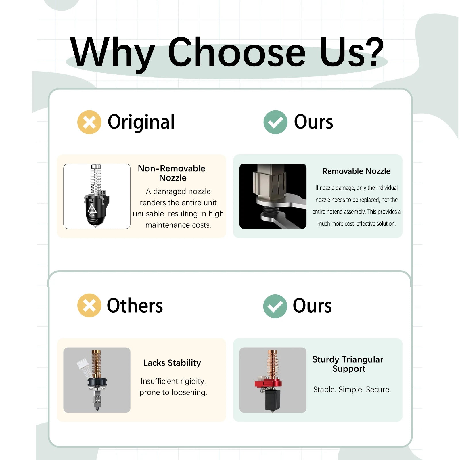 Efficiency Meets Durability: The 0.6/0.8mm nozzles, constructed from high-strength materials, can withstand abrasive filaments such as carbon fiber. They offer increased durability and broader material compatibility, capable of handling abrasive filaments for extended periods while maintaining dimensional precision. Their extended lifespans also reduce the need for frequent nozzle replacements, thus lowering your maintenance costs.