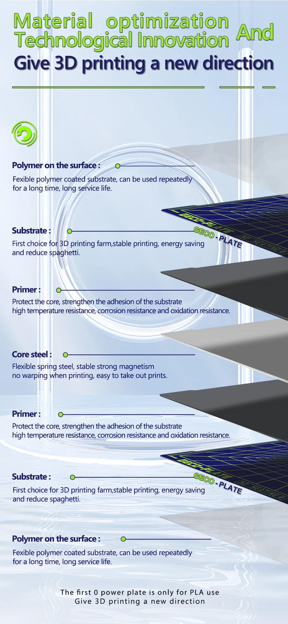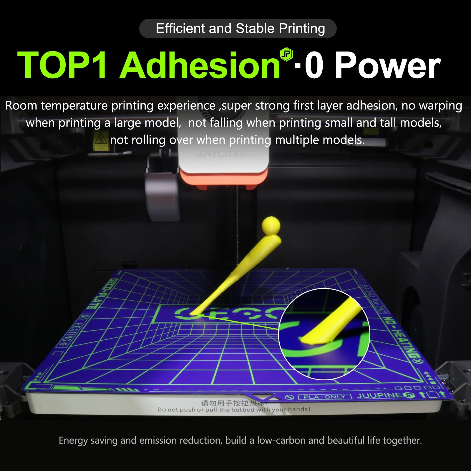 Specially manufactured for PLA,no need to wait for heating up the bed .Under 0℃ printing, with less power,it can save you more energy and reduce printing costs.